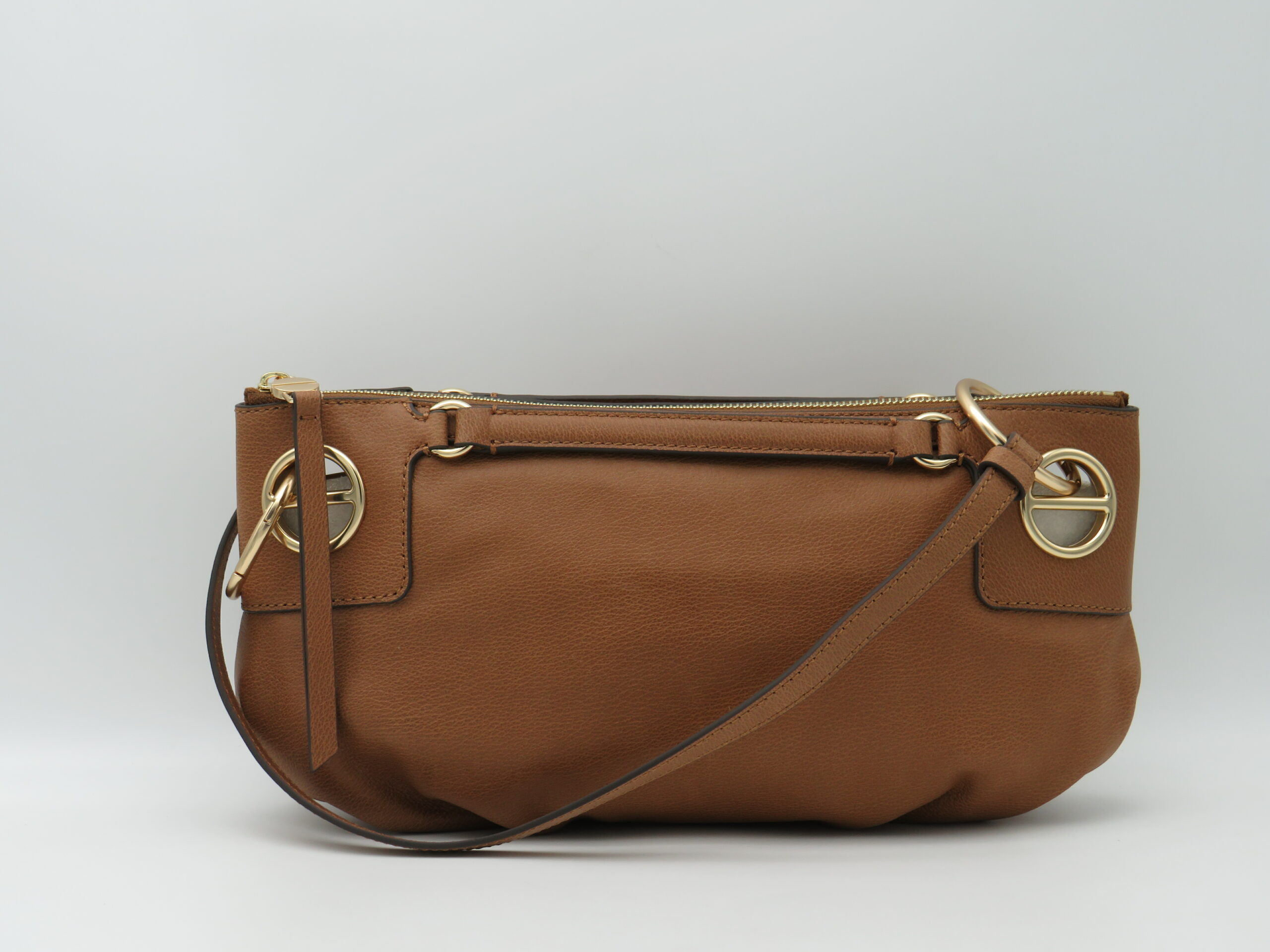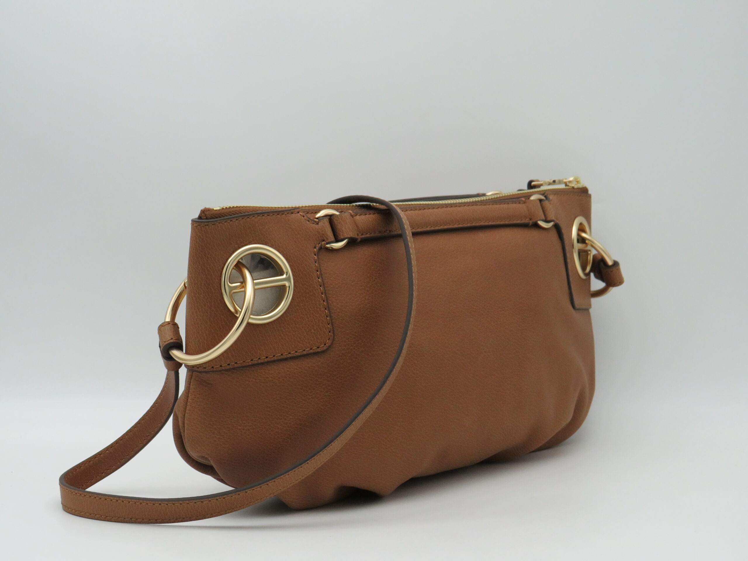 BORSA TRACOLLA PICCOLA ANELLI LOGO METALLO DORATO MODELLO “LONDON” PELLE MARTELLATA CUOIO RADICA